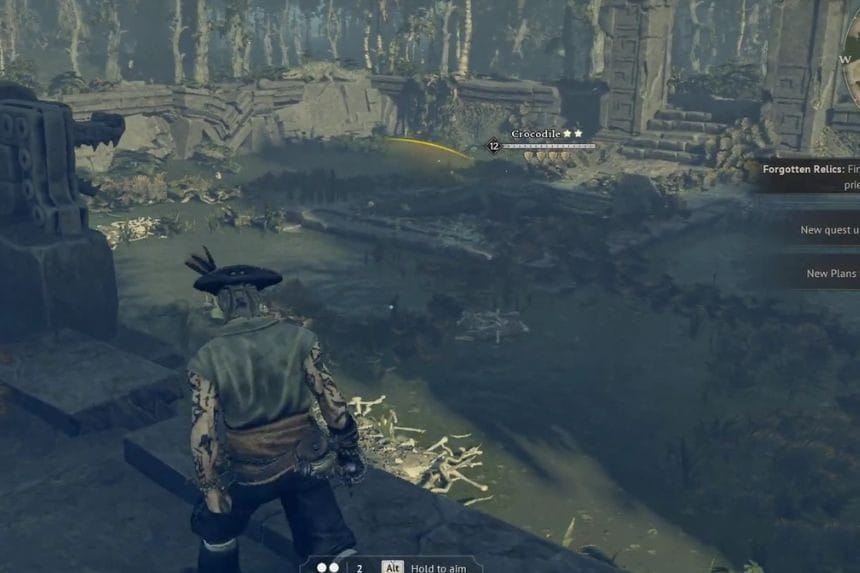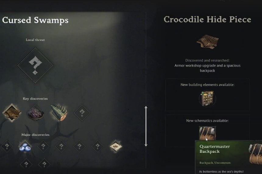 You need to go to the Cursed Swamp, where you are going to get your first piece of Crocodile Hide which is the third region in the game. You won’t have access to this area right away. First, you need to progress through the story and defeat the Foothills boss, Israel Hands. After that, you’ll receive a main quest called Forgotten Relics, which will guide you to your first Cursed Swamp location.