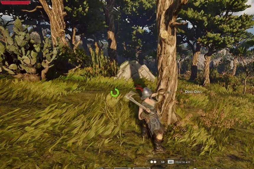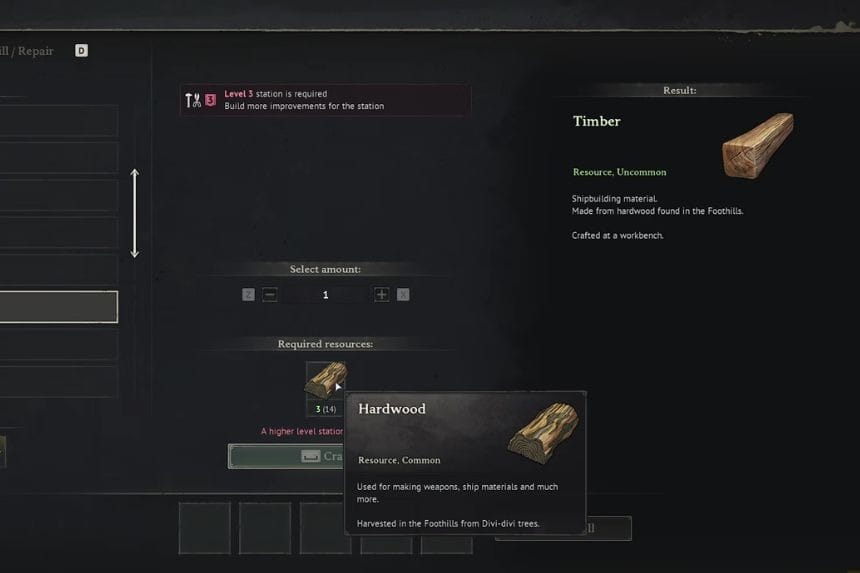 In order to collect the hardwood, you should visit the Foothills biome. To unlock the biome, you will need to defeat Thomas Richards, the game’s first boss. Next, go around the biome and search for any forests consisting of different types of trees known as “Divi trees”. These trees differ visually from the trees you’ve already harvested before. All you need to do is cut them down just like normal trees. When you do, they will drop Hardwood along with Tree Bark, making them a great resource spot.