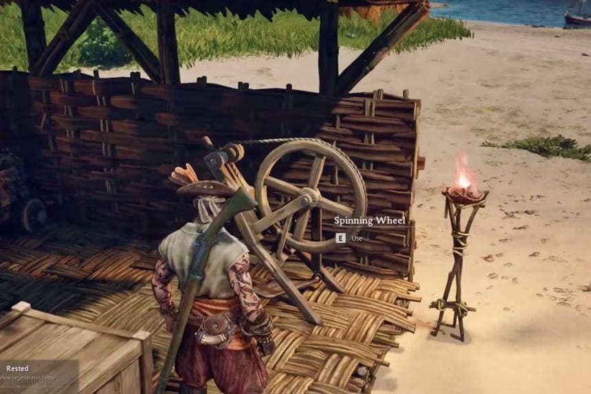 To craft a Spinning Wheel, you’ll need 10 Wood and 5 Rope. Wood is easy to collect, just chop down trees or palm trees using an axe. For Rope, head to your Workbench and craft it using plant fibre, which you can gather from bushes and plants around the map.