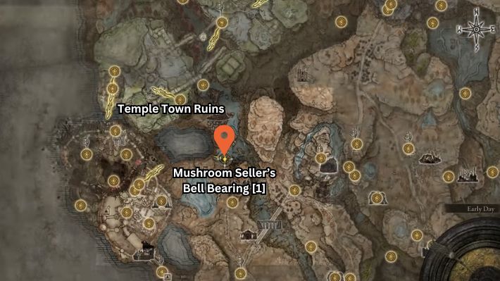 You need to find Mushroom Seller’s Bell Bearing and hand it over to Twin Maiden Husks to unlock a new store. There is Mushroom Seller’s Bell Bearing [1] and [2] that you can find, but you just need to turn in the first one to unlock Redflesh Mushroom from the store. To find Mushroom Seller’s Bell Bearing [1], make your way to Temple Town Ruins and make your way southeast. Jump down towards the stone pillars sticking out from the cliff’s sides and go towards Gravesite Plain