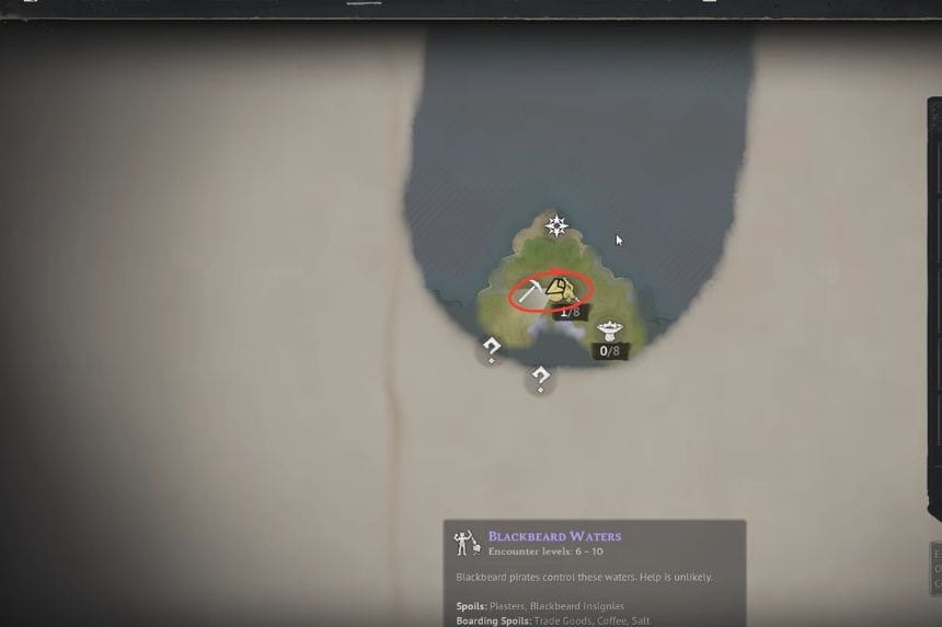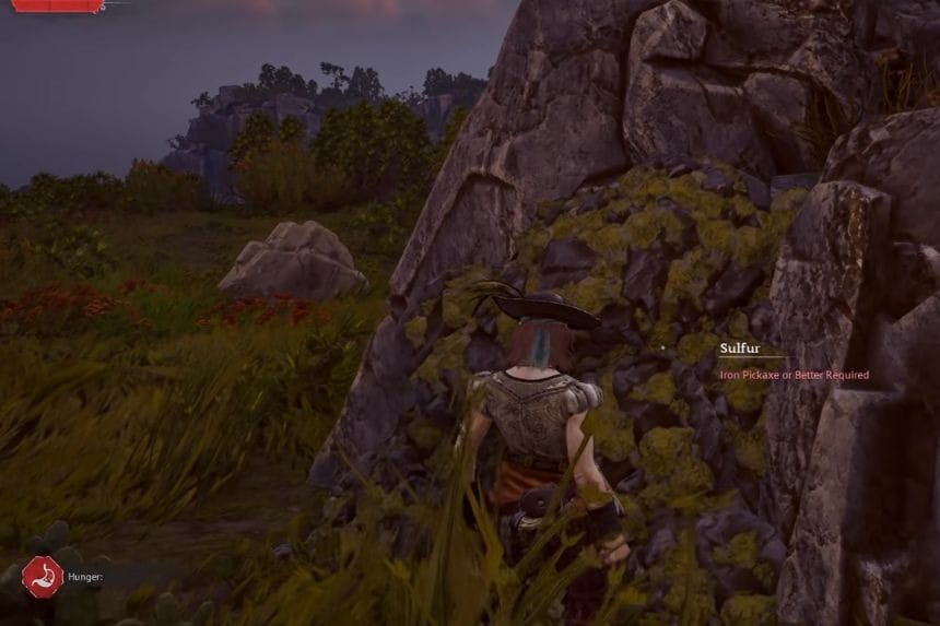 If you want to collect sulfur in Windrose, you will have to progress a little in the game first. You may only get sulfur after the defeat of the first boss, Thomas Richards, in the Coastal Jungle biome. After defeating him, the next unlockable region will be the Foothills. In the Foothills, you will find sulfur nodes on boulders and vertical rocks covered with yellow deposits. These will require you to use an Iron Pickaxe to collect them.