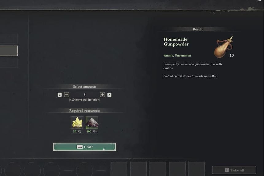 The primary use of sulfur is to make Homemade Gunpowder. Each time you create Homemade Gunpowder, you receive 10 units of gunpowder, thus making sulfur an essential material if you want to use explosives in future or craft some items.