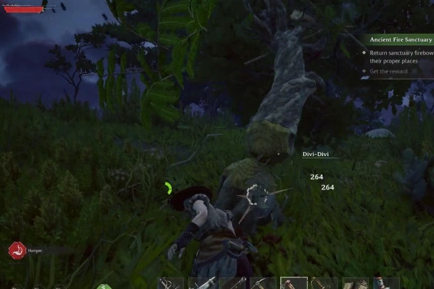 In order to farm this, you would have to exit the starting location and move to the Windrose Foothills. Within this area, you will find Divi Trees. Make sure that you have a Copper Axe; otherwise, you will not be able to farm anything from these trees. You will yield approximately 3 Tree Bark from harvesting each of these trees. Next, you can return to your home base and use an Alchemy Table Level 1. To craft Tannin, simply mix 2 Tree Bark + 1 Clay Bottle.