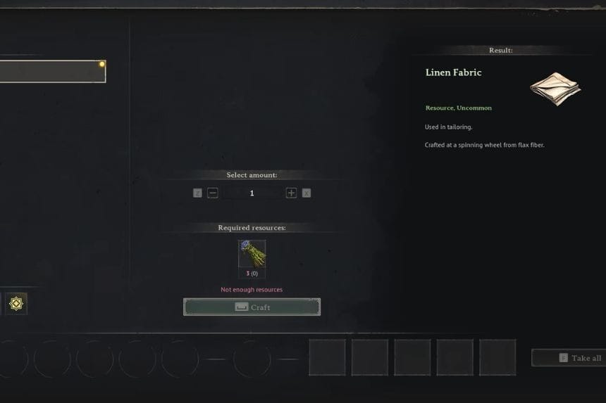 Linen Fabric is a simple resource which you’ll be using frequently in the process of tailoring various pieces of equipment. For crafting, you will require the Spinning Wheel along with some Flax Fiber.