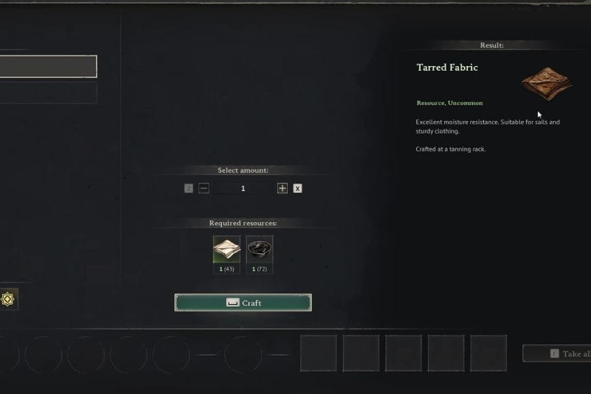 Tarred Fabric is an uncommon resource that’s really useful when you need something tough and resistant to water. This is ideal when making sails and other clothes that are resilient to rough usage. If you plan on crafting Tarred Fabric, remember that you will need a Tanning Rack. Ensure you have built and unlocked this structure in your base before anything else. The ingredients required for crafting Tarred Fabric are as follows: