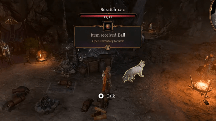 Scratch the Dog has been through a lot after losing his owner, so if he trusts you enough, he will follow you to your camp. Over here, you can pet Scratch and talk to him if you have the Speak with Animals and Animal Handling skills. After a while, during one of your visits to your camp, you will find a ball. You will also notice Scratch having an exclamation mark over his head. This symbolizes that he can be interacted with. Talk to him, and he will tell you what to do about the mysterious ball that has showed up.