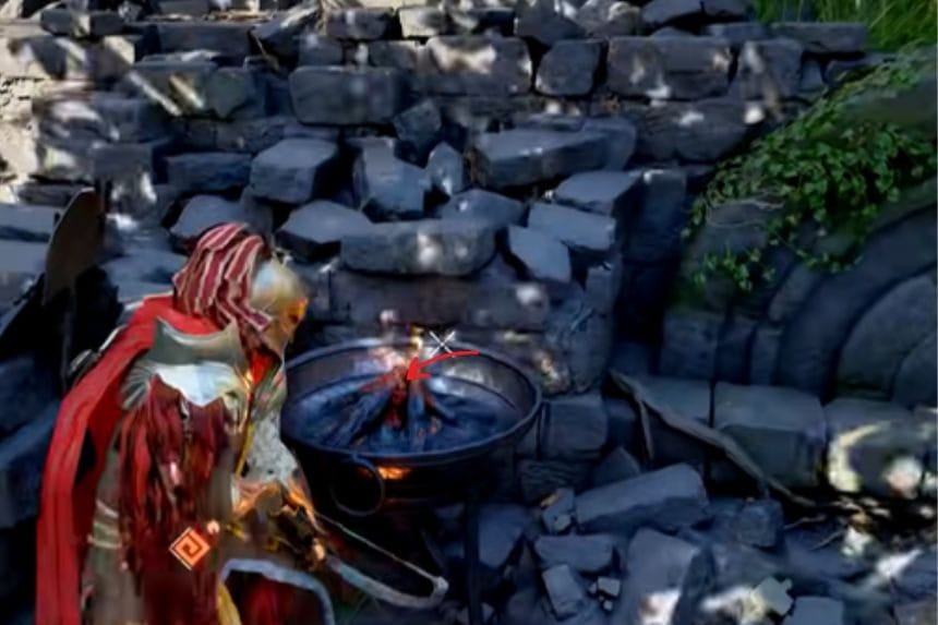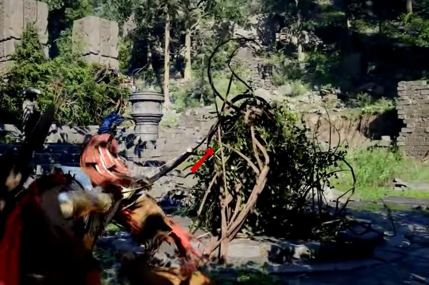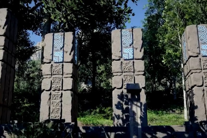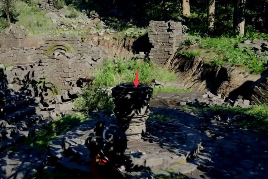 Removing the vines from the stone structure starts the actual Duskwood puzzle. Equip “stab” and get near the slits on the circular stone structure you’ll find in the area. First, stab the slit that will light up all three pillars on the left side; then raise them to the halfway mark of the leftmost pillar.
