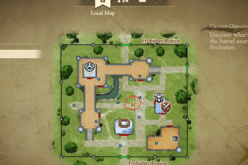 To complete the objective of uncovering what’s buried beneath the barrel near the waterway in the Frobisher region, you’ll need to head over to the exact location marked on the map image above. Once there, you’ll see the Church in front of you. Use the stairs to go up and find the Church’s entrance. After you enter the Church, you’ll see that there is a small opening to the left that leads you to Central Frobisher.