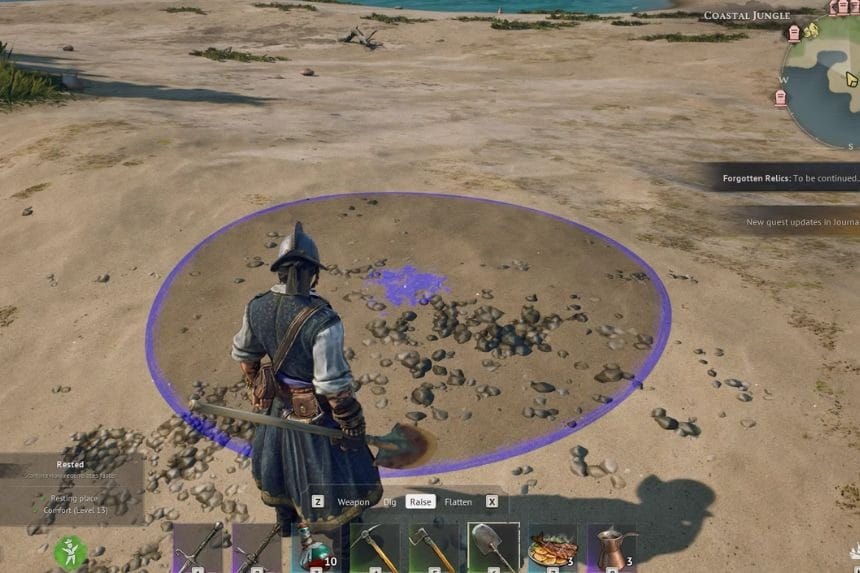 To use the shovel, first equip it, then switch to Dig mode when the option appears. Just press X to change to digging mode, and then click to start digging. The shovel isn’t just for digging; it has a few useful functions. You can dig with it, creating holes in the ground to uncover hidden treasure and items. You can raise or lift the ground slightly, useful for building or creating barriers. You can flatten or level the ground so you can place structures more easily. You can use it as a weapon, but it’s pretty weak.