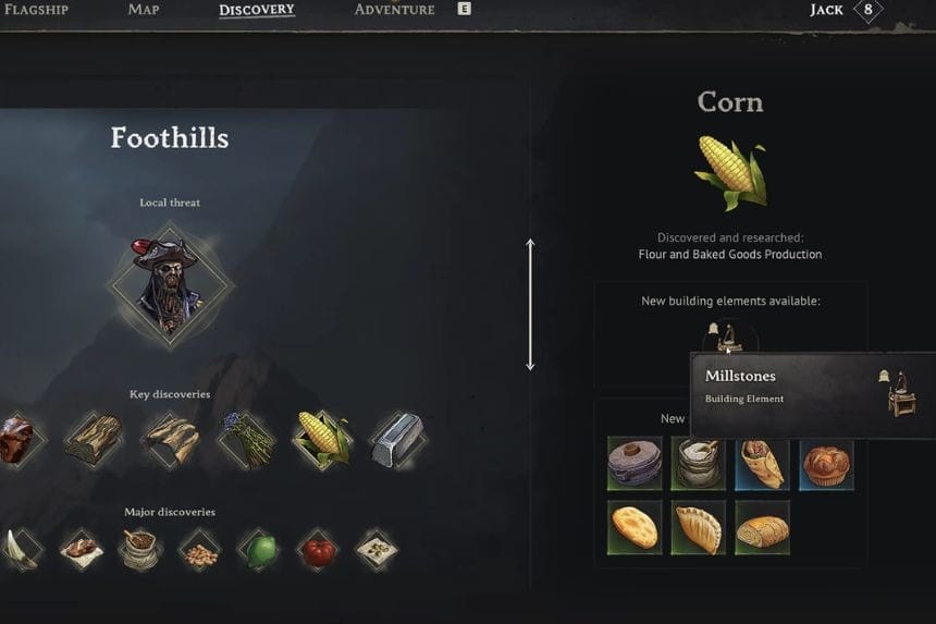 To build a Millstone in Windrose, the first thing you need to do is unlock its crafting recipe. You’ll need to head to the Foothills biome, which becomes available after defeating the first boss. Once you’re there, start looking for corn. Collecting corn will unlock the Millstone recipe.