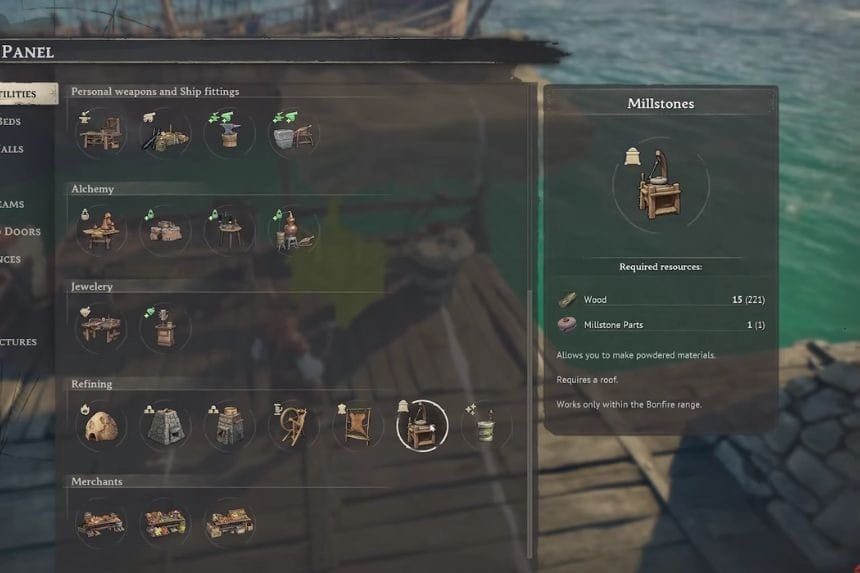 Once you have the Millstone Parts ready, switch to Build Mode and place the Millstones. To build it, you’ll need 1 Millstone Parts and 15 Wood. After setting this up, you’ll be able to move forward with crafting Gunpowder.