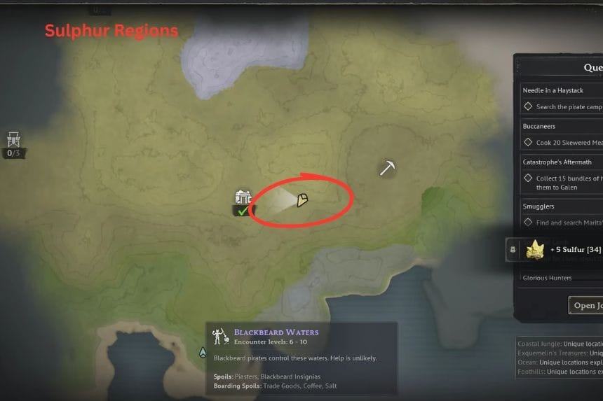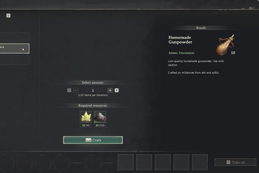 Once you’ve built and set up the Millstones, you can start crafting Gunpowder. To make it, you’ll need two materials: 25 Ash and 25 Sulfur. You can get Ash as a byproduct when you make Charcoal in the Charcoal Kiln. Sulfur, on the other hand, can be found in the world by looking for resource nodes that randomly appear in coastal jungle areas. Just gather both materials, bring them to your Millstones, and you’ll be ready to craft Gunpowder.
