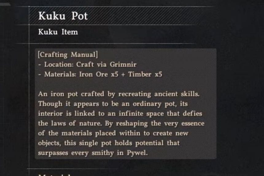 The Kuku pot is an item that is received between chapter 4-6 of Crimson Desert. It allows you to store many items and craft them. Once you obtain it, go to Kilnden Workshop in Hernand; you’ll see a fast travel location at this place so you can have easy access at any time. One of the characters that helps you with everything is Grimnir. You will find him in the Kilnden Workshop and he offers enhancements for crafting items and unlocking other types of technology as well.