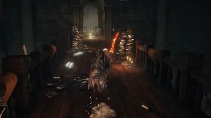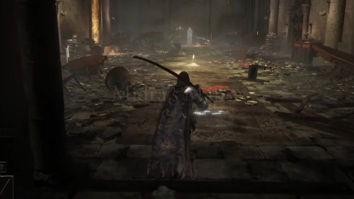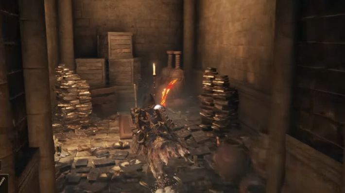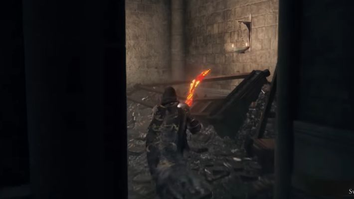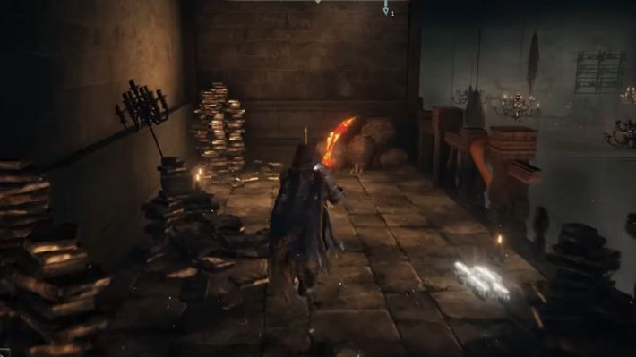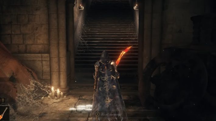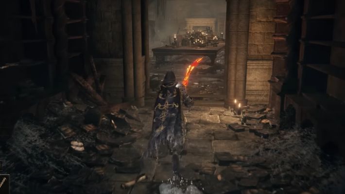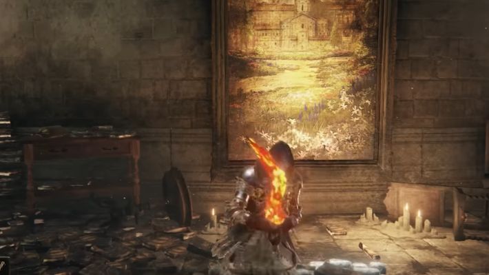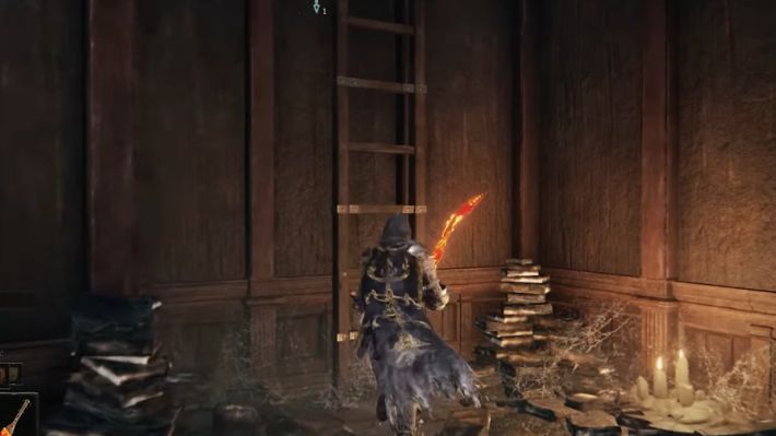 Go up the ladder and exit the room, go right and go up the ladder. Walk across the rafters and you will come across the Midra’s Library site of grace. Jump down from the edge, turn around to the southeast side and you will spot an entrance behind where you jumped off from. Attack the painting on the south side and a flight of stairs will be revealed to you