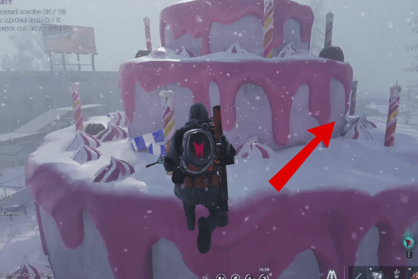 The giant pink cake in the center of Town Mousse is a landmark. To reach the Mystical Crate at the top, you’ll need to use the scaffolding around the cake to climb up to the bottom tier. Fly from scaffolding to the bottom tier of the cake. From there, you can climb the remaining tiers using the candles. The coordinates of the giant pink is (5303, 4667).