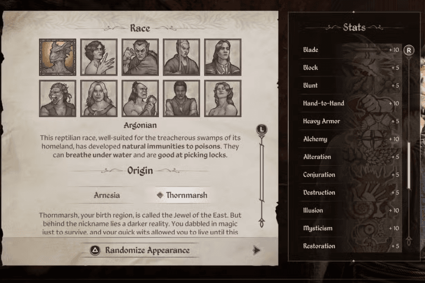 - Argonian: Choose The Warrior for increased Strength and Endurance, or The Lord for improved armor rating and magic resist.