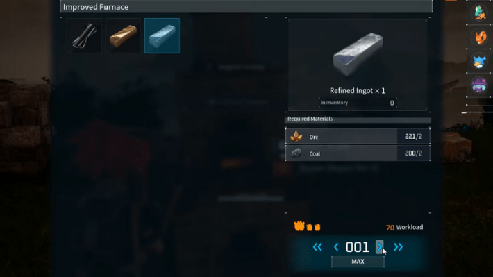 Before you begin crafting Refined Ingots, you would need a better furnace than your primitive one. Once you reach Level 34, you can unlock the Improved Furnace. For this, you would require the following materials