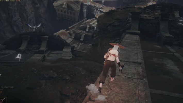 From there, keep heading north through the ruins and you will come across the Fissure Waypoint site of grace. From there, travel northeast to east and follow the path into a cave. Keep to the east side and keep going east while jumping across gaps.