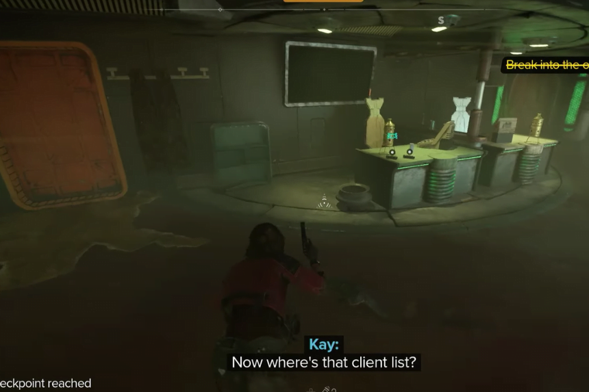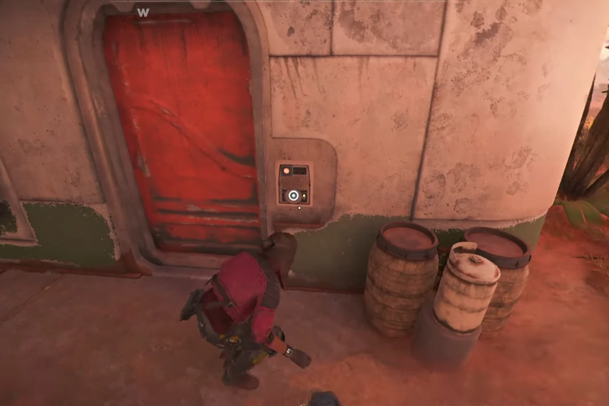 The treasure is inside the building near the arched gate. To unlock the door, interact with the lock and pay attention to the yellow circle on the right. It will flash and beep in a specific rhythm. You must press the button simultaneously with each flash to unlock the door. If you press the button correctly, a blue light below the yellow one will also flash. However, you must complete the entire sequence without mistakes to open the door successfully. Once inside, you’ll encounter a guard who must be defeated before you can proceed. The treasure is located on the left side of the building’s entrance.