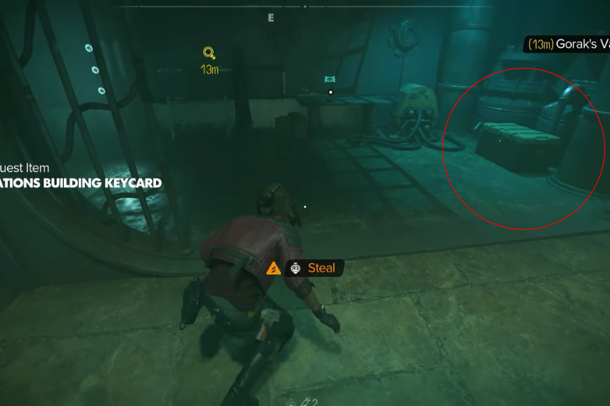 To get to the treasure walk towards the big arch, go right and up the Cliff. Some guards will be near the tree, and you have to fight them. Following this, proceed toward the building right in front of you. Once inside the room the treasure is only a few steps ahead from this entrance.  You can acquire the H-M Engine Power Core as a reward for exploring this location.