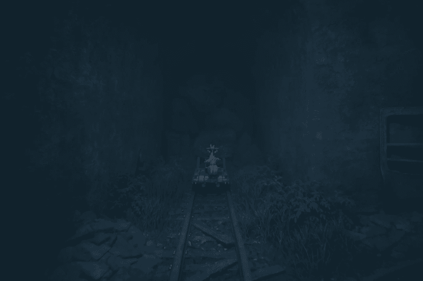 Step off the handcar and turn your eyes left. A narrow gap cuts into the stone there – slip through it. Beyond lies a quiet hollow where the statue sits, still and unlit. Ignite the wick before stepping back onto the trail ahead.