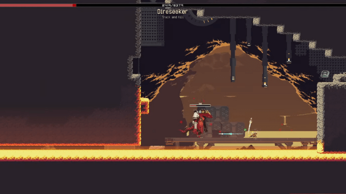 You need to make your way to the Direseeker and defeat it to unlock the Miner. For that, you need to step foot on the lava and pass through the narrow passage that leads to the bottom right. Hopoo Feathers, high mobility, and having incredibly high health can help you here. Keep jumping and running across to avoid lava damage. Once you reach the area, defeat the boss to unlock the Miner