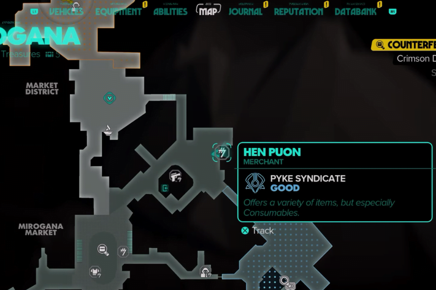 The trader you’re searching for is Hen Puon. You can find him in the eastern part of Mirogana Market, not too far from where the Pyke district starts on the north side.
