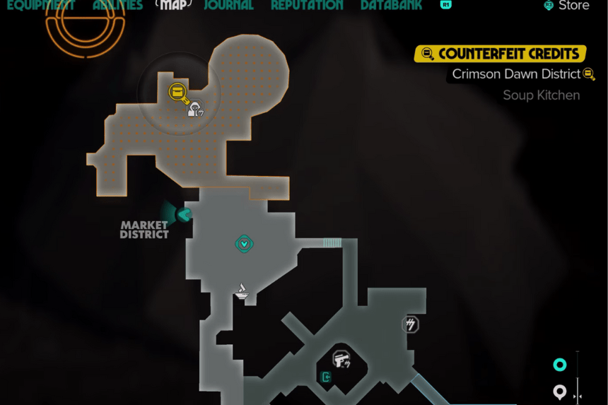 When you find Hen Puon, you’ll need to sell something to him so you can get some of his fake money. As soon as you do, Kay will talk to him about the counterfeit credits. He’ll then tell you to go to the Crimson Dawn’s soup kitchen.