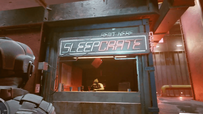 Once you talk to Izan, you get the option to buy a Sleepcrate or rent one. If you are planning on owning a Sleepcrate, you can pay 6500 credits and get the key to one of the shipping containers. To find your Sleepcrate, take the elevator when you go further right, past the Sleepcrate vendor. The elevator will be on your left. Ride the elevator up, then run down the passage to find another elevator at the end. Once you reach the upper floors, follow your marker to find your crate and use your key. The Sleepcrate has one bathroom and one bed, which is enough for one person.