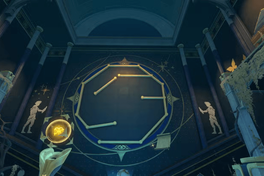 The puzzle room is blocked by a dry pool in the Slumbering Palace Corridor. To enter it, you will have to go through a multi-step procedure consisting of Evernight/Dawn mechanics, traversing the environment, and puzzle triggering.