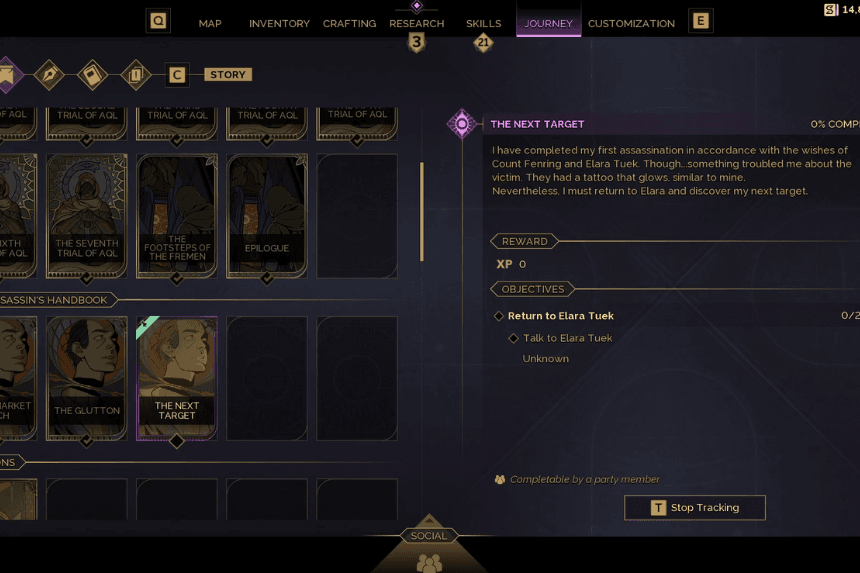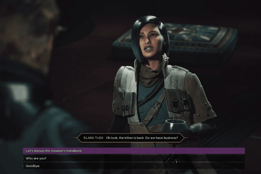 Sparring with Elara Tuek will advance you through the “The Next Target” contract. She’ll send you to your next target—the Glutton—a target that is central to this contract and the broader questline called The Assassin’s Handbook.
