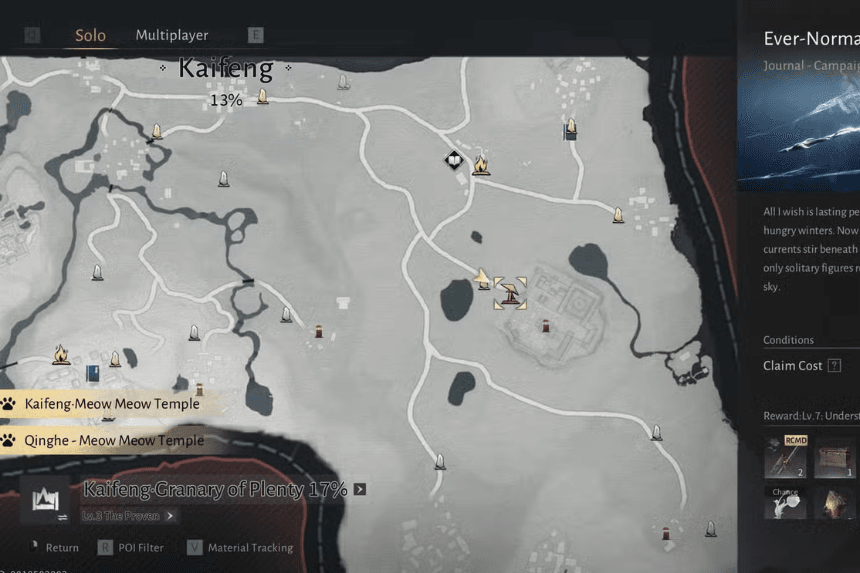 Zheng E appears during the Ever-Normal Granary campaign, which will become available down south of Kaifeng once you unlock the area through the story missions. As soon as that area of the map has been revealed, the ever-normal granary will be clearly visible on the map once fully zoomed in.