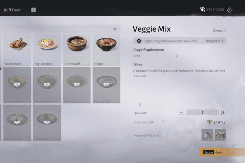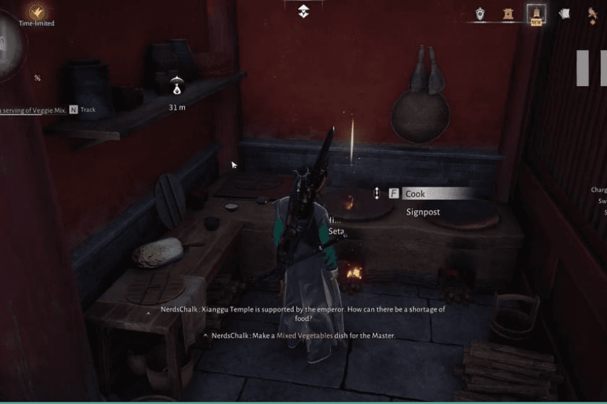 After having talked to him, proceed to the temple’s kitchen. It is very near and not hard to find. Use the stove inside and select Veggie Mix within the cooking menu. You will not need rare ingredients, as most players already have them all in their inventory. Prepare the meal and then bring the dish back to Jingxuan.
