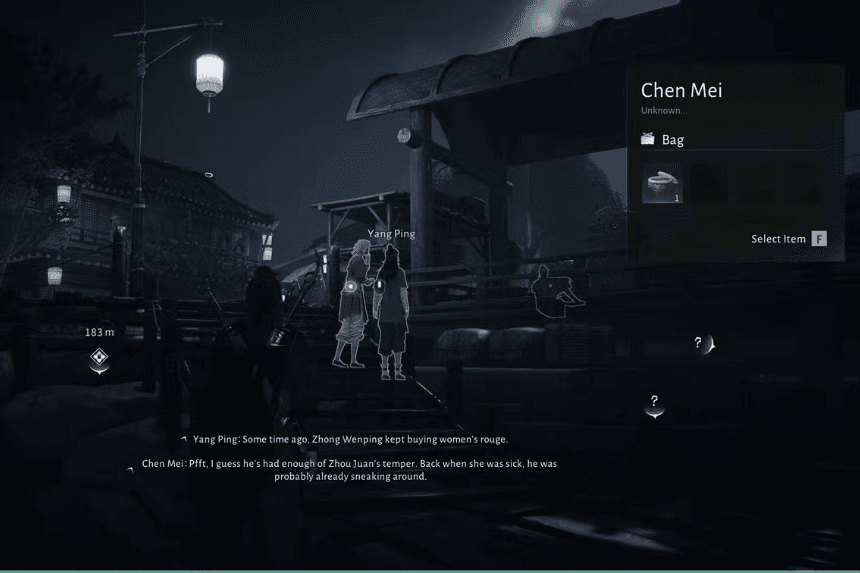 Zhong Wenping himself is sitting at a stall just across the staircase nearby, mourning his late wife, Zhou Juan. When speaking with him, you have an opportunity to either ask him questions or accuse him of wrongdoing. Either way, he claims he is innocent of the crimes. Mention the Blush, and he’ll say it was his wife’s; recovering it is all the more important now.