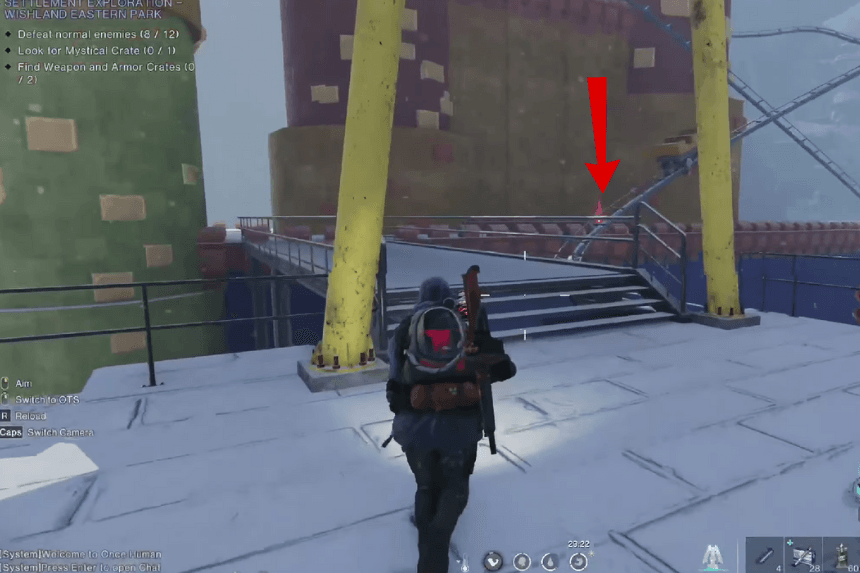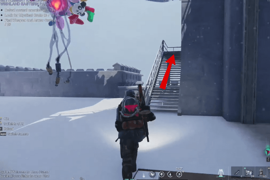 As you reach the rooftop, you will find steel stairs on the right-side. Climb the stairs, go up to the rooftop and cross the steel bridge. As you cross the steel bridge just on the right-side of the rooftop you will find the Mystical Crate. If you don’t want to use this long route you can jump from the nearby cliff near the castle and you will land directly beside the crate.