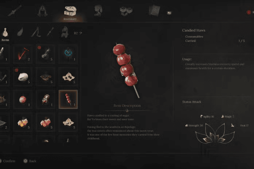 Following a use of the Gaze pose to gaze over the horizon to be reunited with the faces of the past, players will find they have been awarded 1x Candied Haws. This is a consumable item which doubles Stamina recovery speed and maximum health for a limited time, and players might find it beneficial in battling a tough boss in Wuchang: Fallen Feathers. Nevertheless, the item can only be used by players once, and players are certainly not required to pick it up.